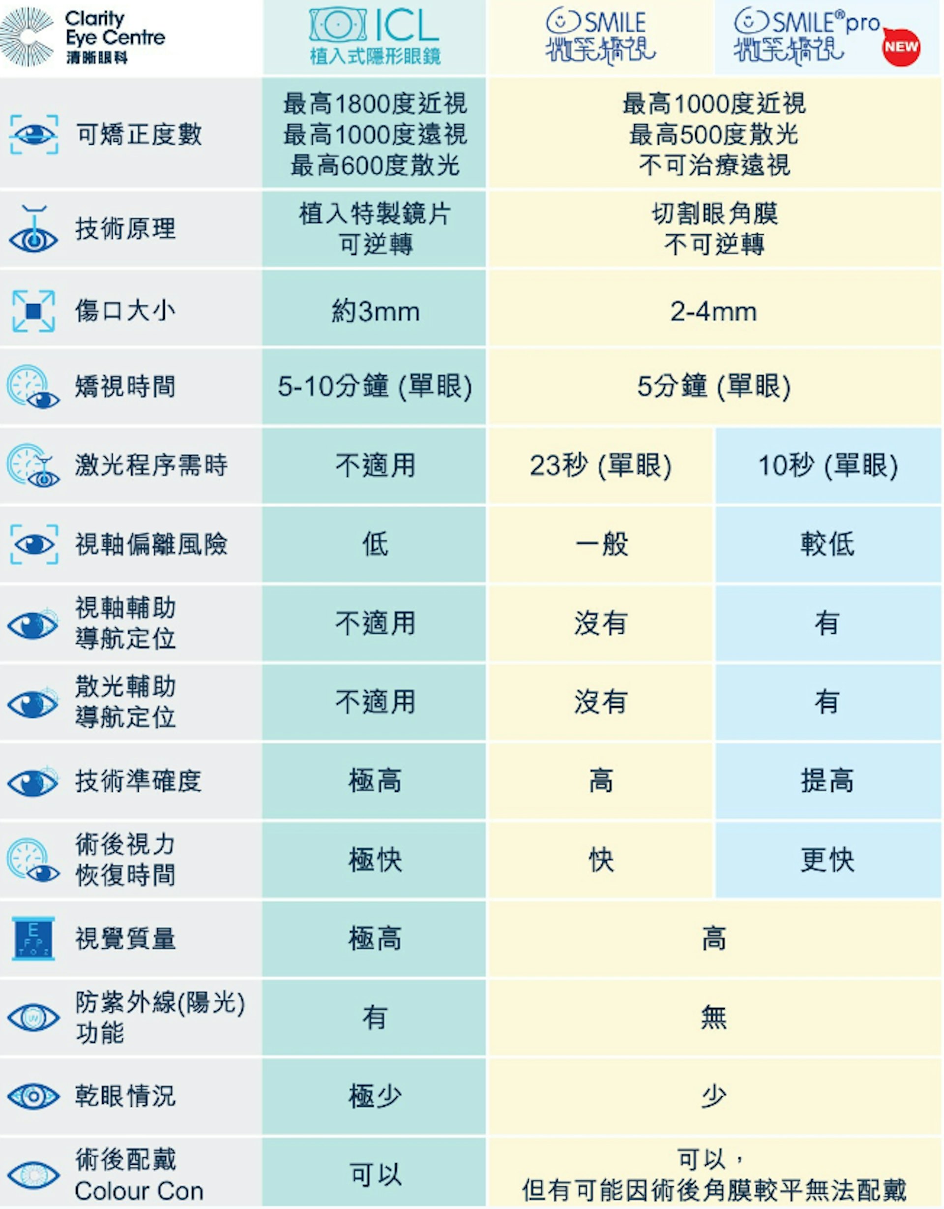 SMILE微笑激光矯視(Small Incision Lenticule Extraction)是一項較新的矯視技術,在不用打開角膜瓣的情況下,以全飛秒激光直接切割角膜中層、塑造微透鏡改變角膜弧度,從而矯正近視和散光,也是大眾會考慮的熱門矯視選擇,不同之處在於可矯正的種類、度數,SMILE可矯正最高1000度近視和500度散光,且不可治療遠視,而ICL則可矯正最高1800度近視、1000度遠視和600度散光。另外,ICL屬「可還原技術」,若術後因眼部問題或因應未來科技發展希望進行其他治療時,可隨時取出或更換鏡片。由於ICL不需要切割角膜,因此不存在角膜復原問題,亦大大減少乾眼情況出現;但SMILE需切割眼角膜,一旦進行後就不可逆轉,大眾可在了解兩者分別後選擇適合自己的矯視方案。